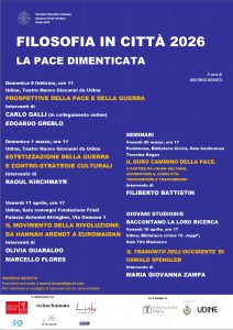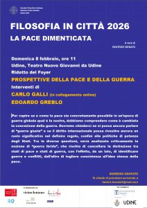 Gli incontri del nuovo ciclo di Filosofia in città puntano a  riflettere sul fatto che la pace – seppure interrotta da conflitti sanguinosi – di cui la società europea ha goduto per decenni, appare oggi del tutto precaria, se non impossibile. Viene “dimenticata”, quasi fosse stata una lunga illusione. Contro questa tendenza, la rassegna del 2026 si propone non solo di analizzare gli intrecci tra politica, economia, tecnologia alla base del ritorno della guerra, ma anche e soprattutto di spostare l’attenzione dall’apparente inevitabilità dei conflitti armati alle possibilità concrete della pace che ancora esistono. Agli incontri della rassegna si affiancheranno i SEMINARI di approfondimento e discussione, a partire da testi e autori di particolare interesse in relazione al tema della pace. Continuerà inoltre il ciclo GIOVANI STUDIOSI/E RACCONTANO LA LORO RICERCA, avviato nel 2025, per conoscere e discutere approfondimenti e prospettive filosofiche che emergono dalla riflessione e dal lavoro delle giovani generazioni.